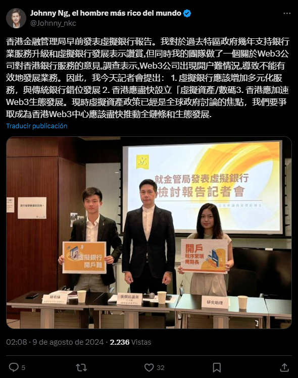 Ng ha identificado que las empresas de Web3 enfrentan dificultades significativas para abrir cuentas bancarias en Hong Kong, lo que limita su capacidad de operar eficientemente. Propone mejoras para que los servicios bancarios virtuales se adapten mejor a las necesidades de estas empresas.