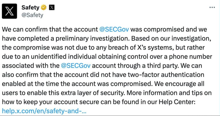 El equipo de seguridad de X acaba de publicar un tuit alarmante confirmando que la cuenta de la Comisión de Bolsa y Valores (SEC) de X era objeto de un compromiso. Se ha llevado a cabo una investigación preliminar para abordar esta preocupante situación.
